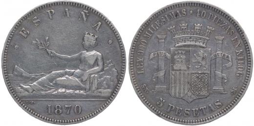 5 Peseta 1870/70 Madrid, Y.60, KM.655
