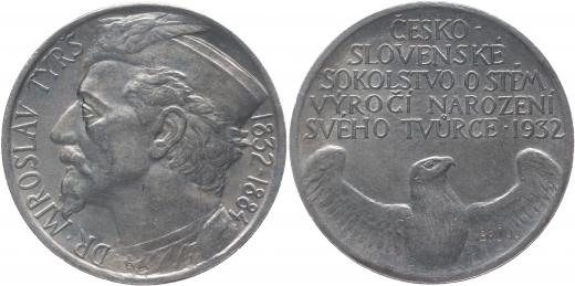 ČOS - 100.výročí narození Dr.Miroslava Tyrše, 1932#Ag Portrét v sokolské čapce zleva, opis / sokol, nápis, Sign., Punc. 987, Ag 42 mm, 30.092 g