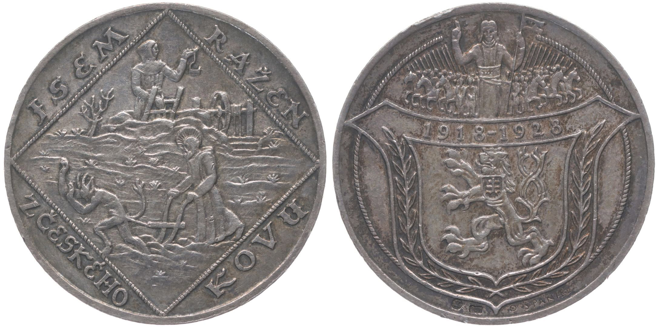 Jsem ražen z českého kovu - 10. výročí republiky 1928#Ag Sv.Prokop orá s čertem, havíř, opis / státní znak, Sv.Václav s rytíři, Sign., Punc.987, Ag 34 mm, 20.1 g