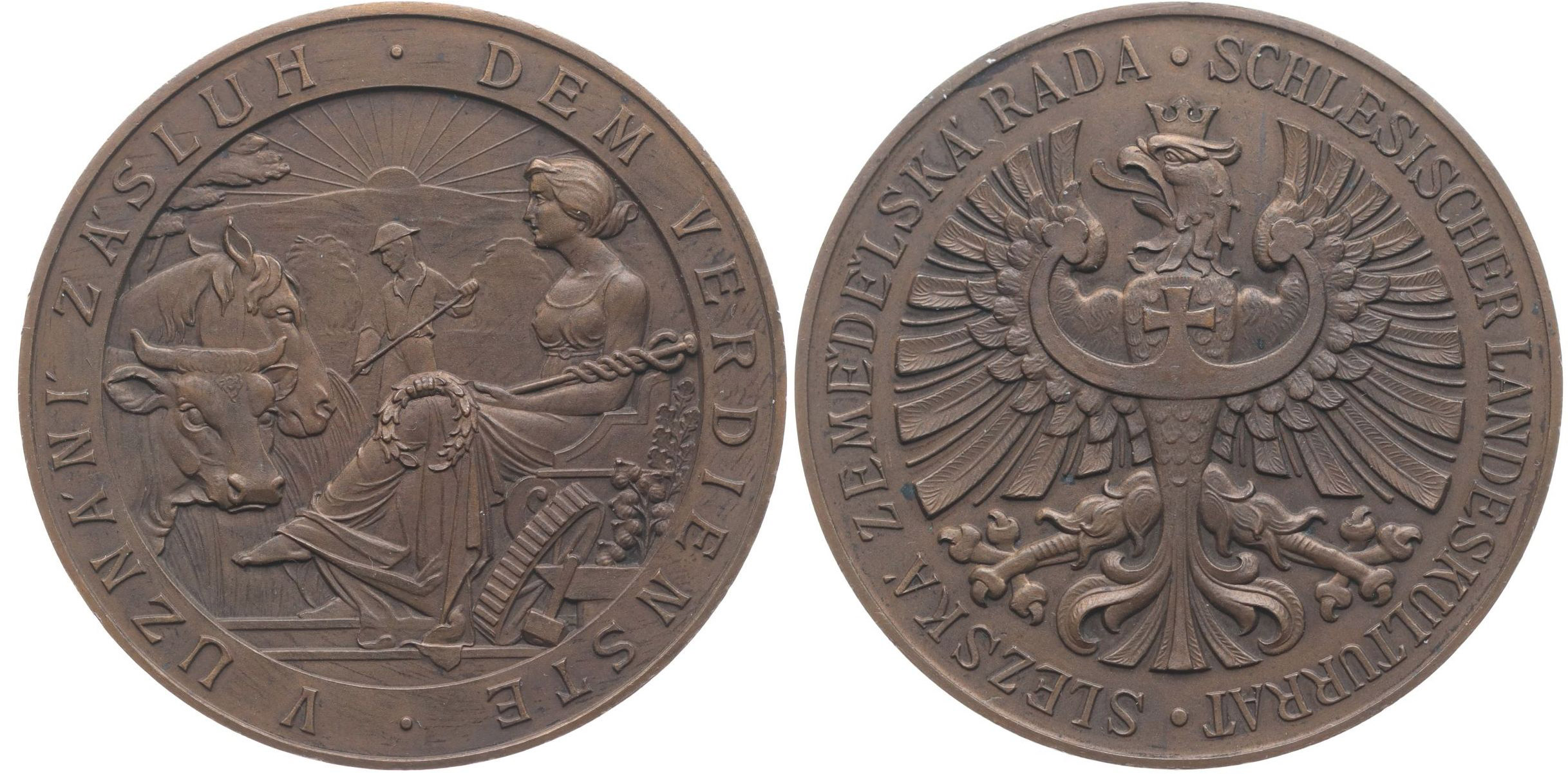 Nesign. - v uznání zásluh - Slezská zemědělská rada, b.l. Sedící žena s Merkurovou holí, hlava koně a krávy, česko-něm.opis / slezská orlice, česko-něm.opis, Bronz 52 mm, SJ.II.2