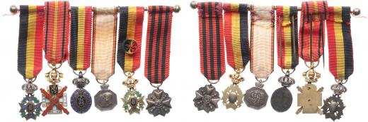 Soubor 6 ks vyznamenání na spojce: 1) vyznamenání práce za průmysl. zásluhy II.tř. 2) pamětní záslužný kříž 1918-29 3) vyznamenání práce II.třídy 4) medaile na 100 let Belgie 5) vyznamenání práce za průmyslové zásluhy I.třídy 6) stříbrná medaile za dlouholetou službu _orig.stuhy celk.6 ks