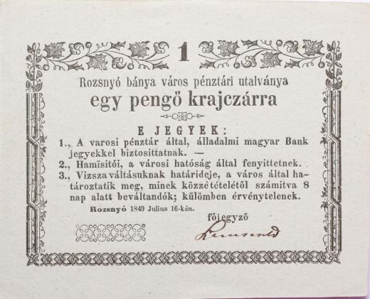 Rožňava (Rozsmyó) - 1 Krejcar 16.7.1849, Vizsza - s vodotiskem bez čísla, Adam.Roz.1.1.2