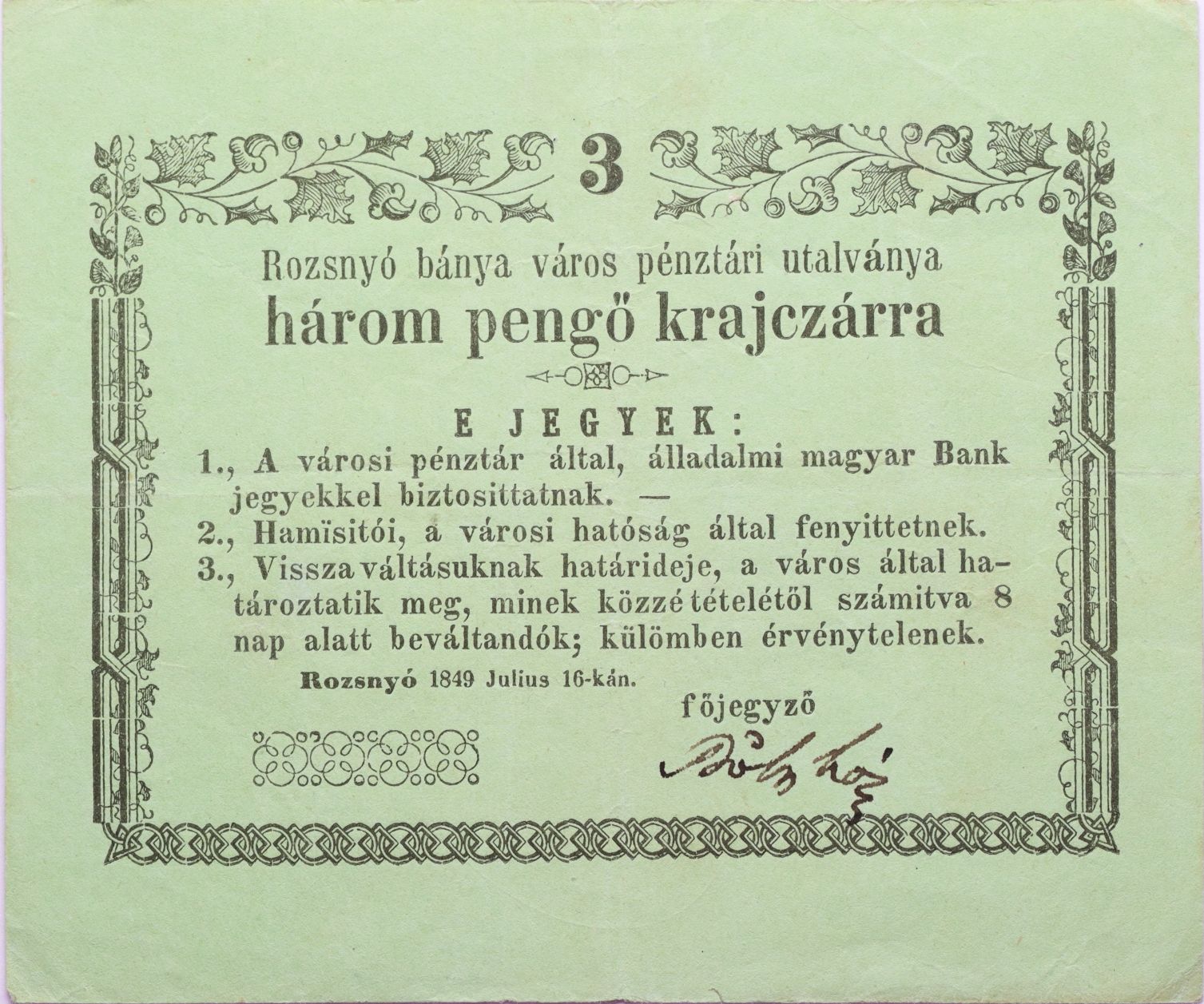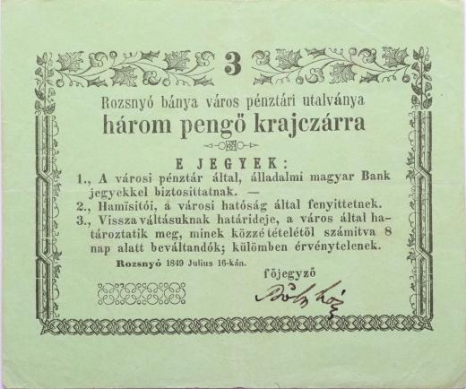 Rožňava (Rozsmyó) - 3 Krejcar 16.7.1849, Vizsza bez čísla, Adam.Roz.1.2.1