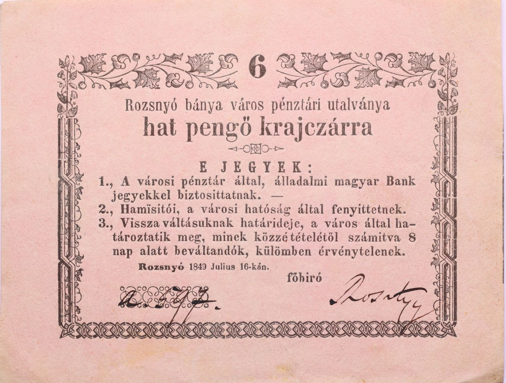Rožňava (Rozsmyó) - 6 Krejcar 16.7.1849, sér.a597 růžový papír, Adam.Roz.1.3.1