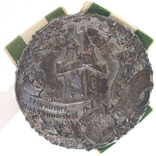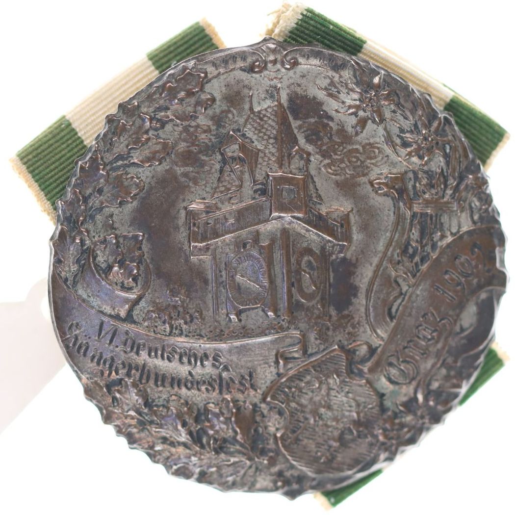 Graz - v upomínku na 6.německé setkání pěveckých spolků 1902 Věž radnice, pod ní znak Štýrska, na stuze nápis Obecný kov 40 mm, v rev.výrobce_se špendlíkem se stuhou
