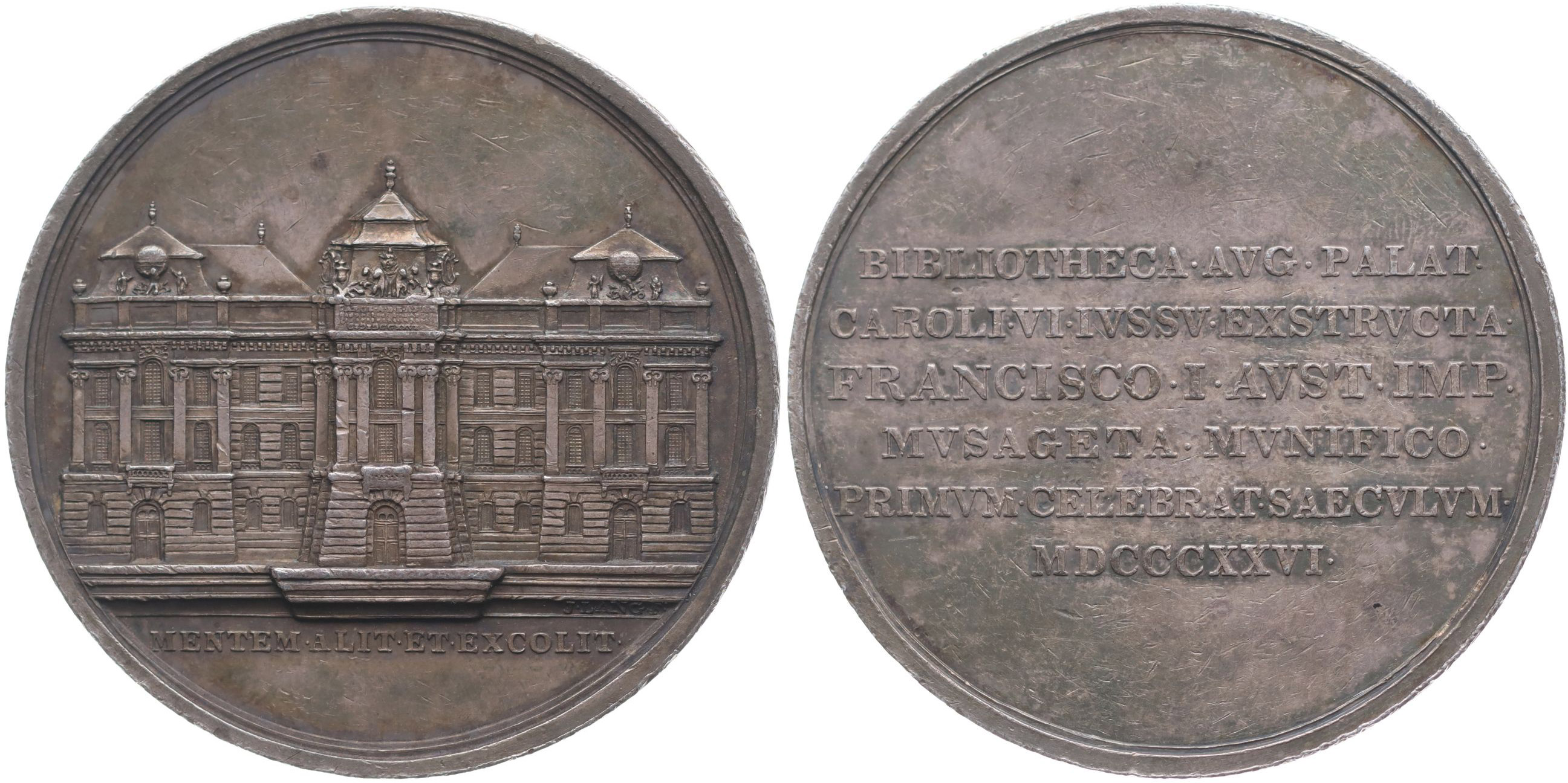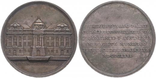 J.Lang - na slavnost sekularizace dvorní knihovny, 1826 Pohled na budovu, nápis v úseči / 6řádk.nápis Sign., Ag 51 mm, 52,56 g, LG.XII/139, Mont.2503, Ho.-_R!