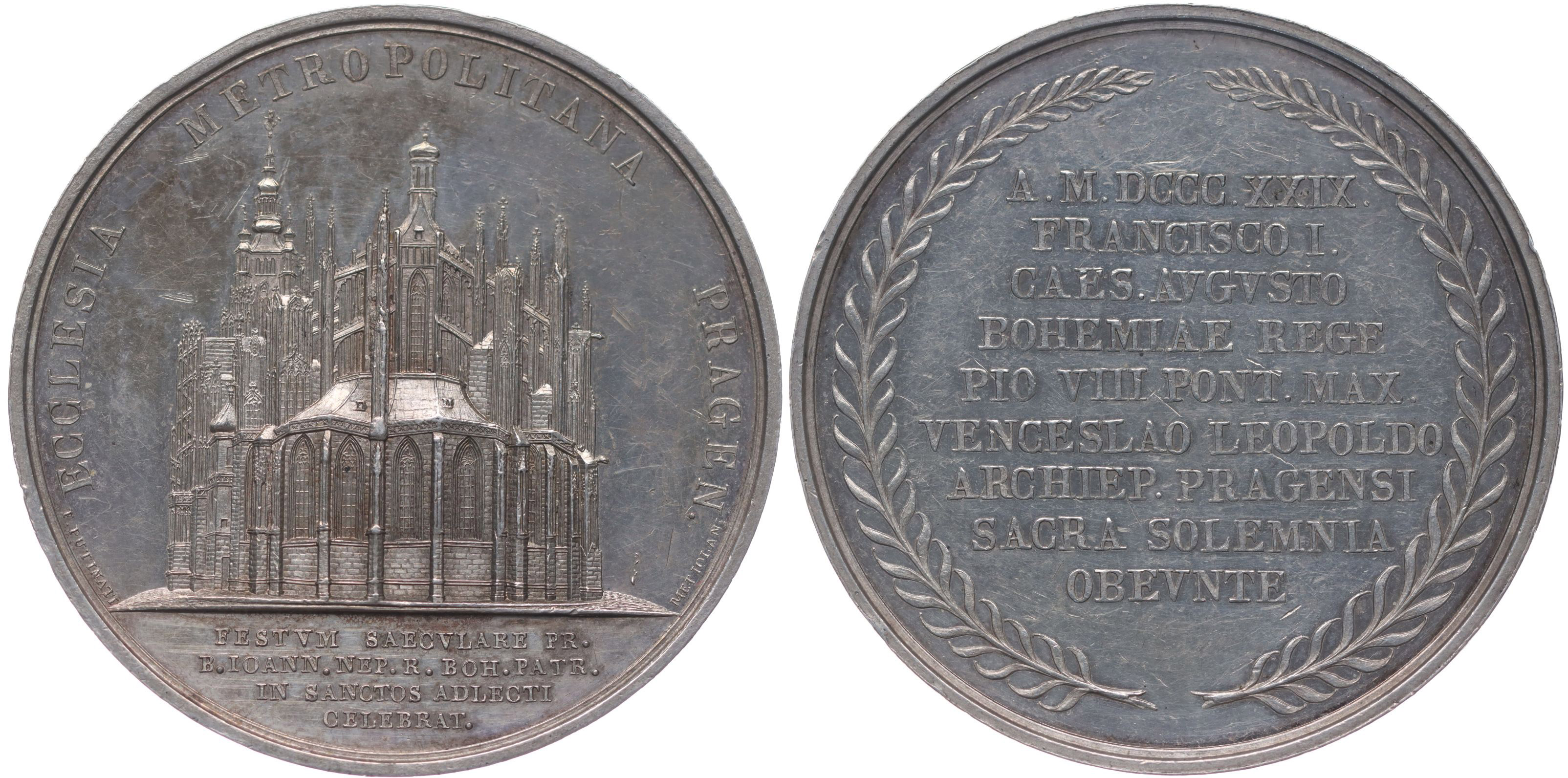 F.Putinati - 100 let svatořečení Jana Nepomuckého, 1829#Ag Chrám Sv.Víta, 4řádk.nápis v úseči, opis / 9řádk. nápis ve vavřínovém věnci, Sign., Ag 50 mm, 62,91 g, Don.4654, Přib.574_R!