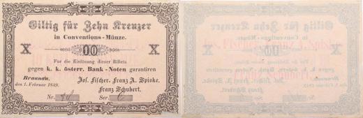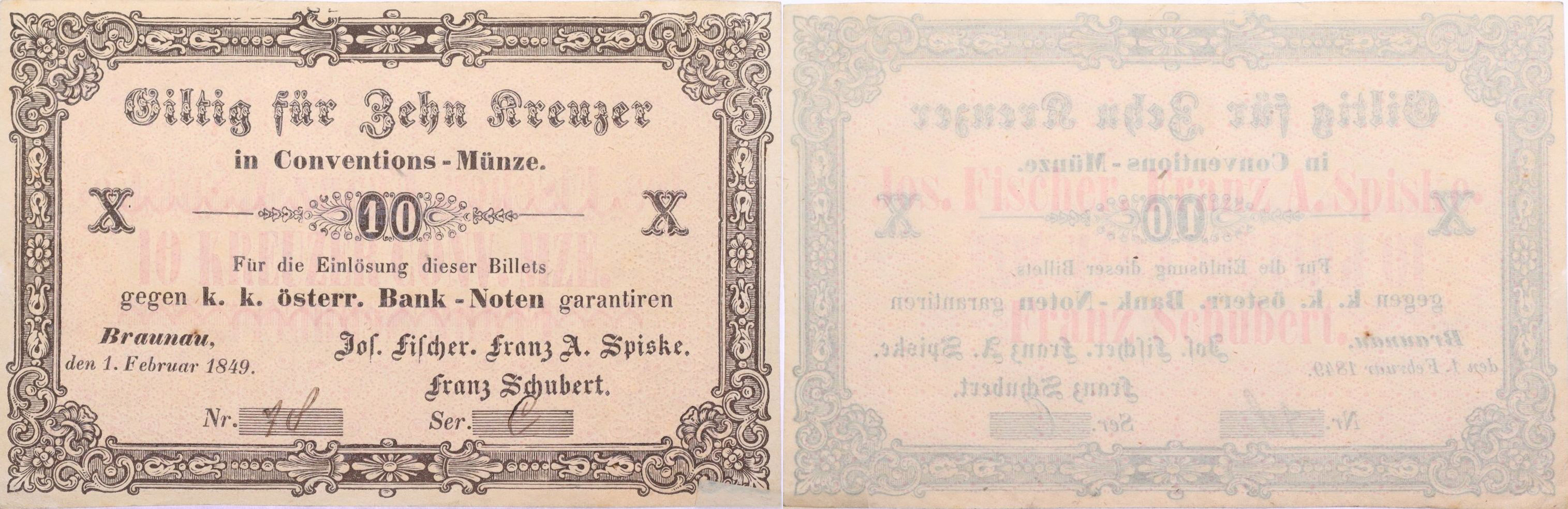 Broumov (Braunau), 10 Krejcar 1.2.1849, J.Fischer, F.A.Spiske, F.Schubert, čísl 78, sér.C, bez raazítka a bez podpisu, V-R.140.02.04