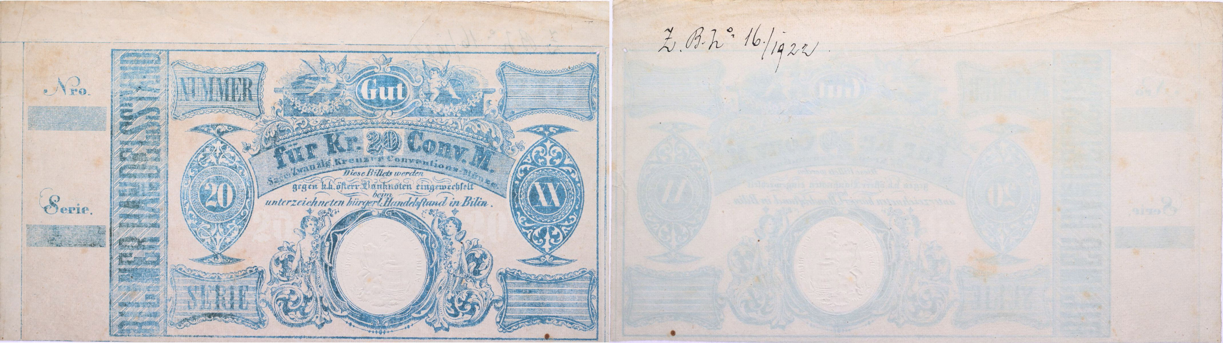Bílina (Bilin) - 20 Kr. C.M., b.l., Biliner Handelsstand, bez čísla, série a podpisu, V-R.85.03.02.a
