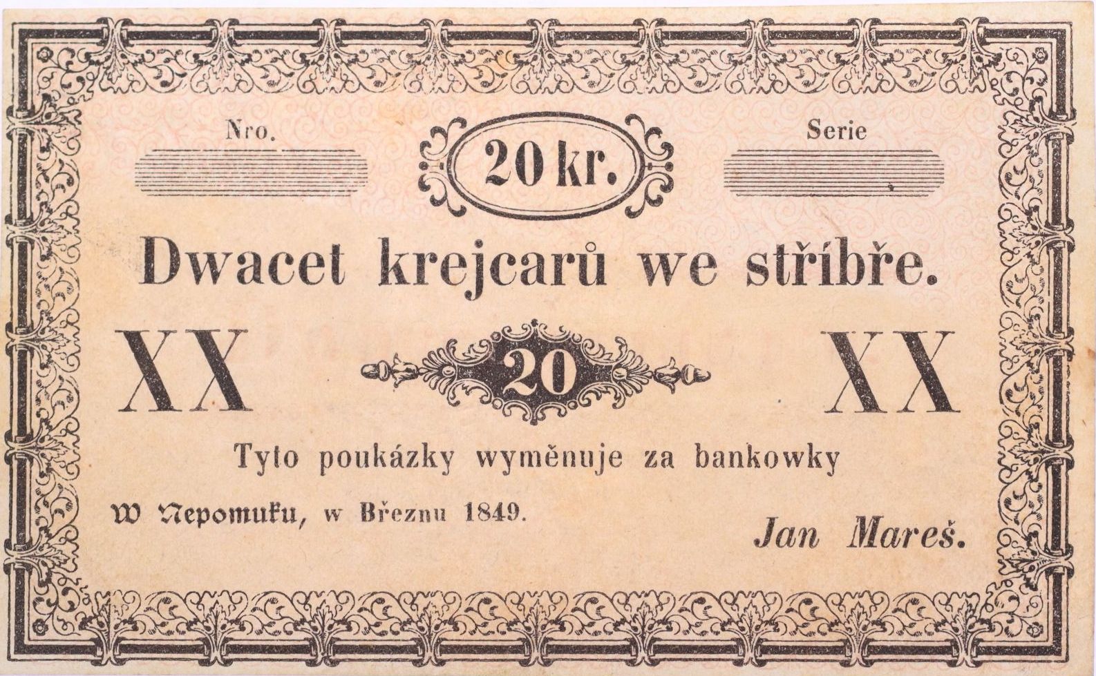 Nepomuk - 20 Kr.stř. III.1849, Jan Mareš, bez série, čísla a podpisu V-R.905.02.04