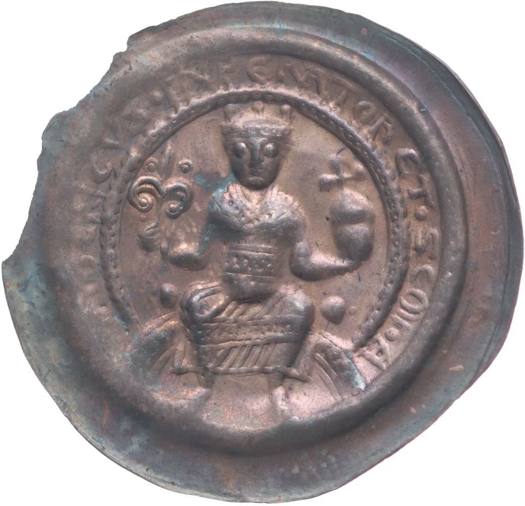 Brakteát b.l. z let 1180-1190, opis: FRIDERICVS.INPERATOR.ET.SEMP.A Sedící korunovaný císař s liliovým žezlem a dvojitým jablkem minc.Altenburg, 32 mm, Bonh.1171, Fd.Gotha.529 _starý podl.lístek RR!