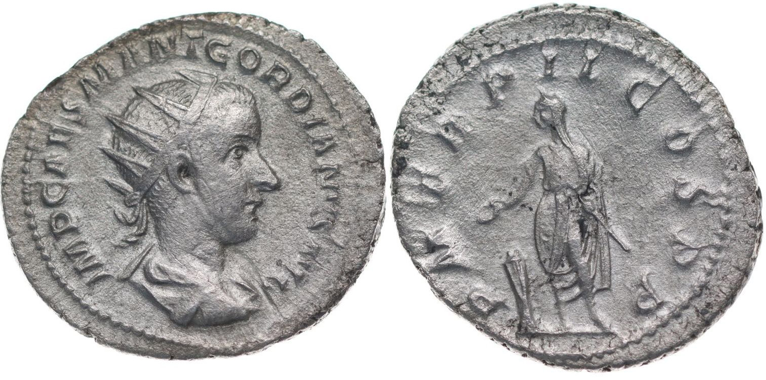 AR Antoninianus, Rv:"P.M.TR.P.II.COS.P.P.", stojící Gordianus pokládá oběť na oltář, K.72.32.14, S.2349, C.210, RIC.37