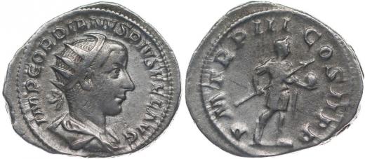 AR Antoninianus, Rv:"P.M.TR.P.III.COS.II.P.P.", stojící Gordianus zprava s kopím a globem, K.72.36.5, S.2352, RIC.88