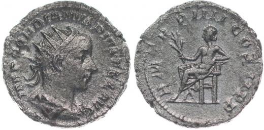 AR Antoninianus, Rv:"P.M.TR.P.IIII.COS.II.P.P.", Sedící Apollon zleva s ratolestí, K.72.37.1, S.2352, C.250, RIC.88