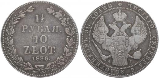 10 Zlotych (1 1/2 Rubl) 1836 NG, KM.134, Uzd.4050 skup.I-A/a