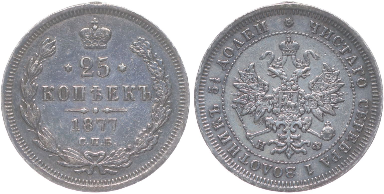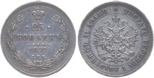 25 Kopějek 1877 SPB-NF, Y.23, Uzd.1884 skup.XIX-V/v