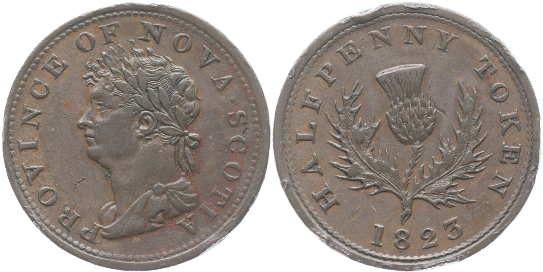 1/2 Penny token 1823, portrét George IV., KM.1_dr.hry