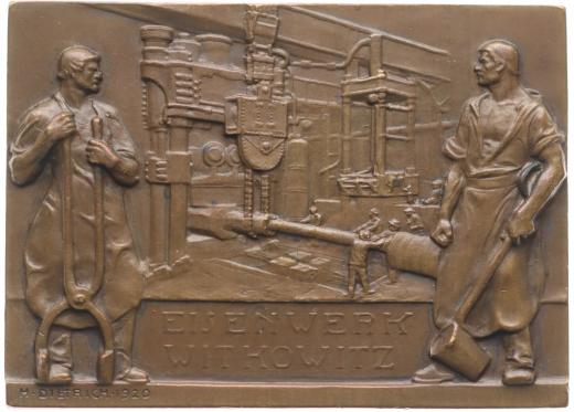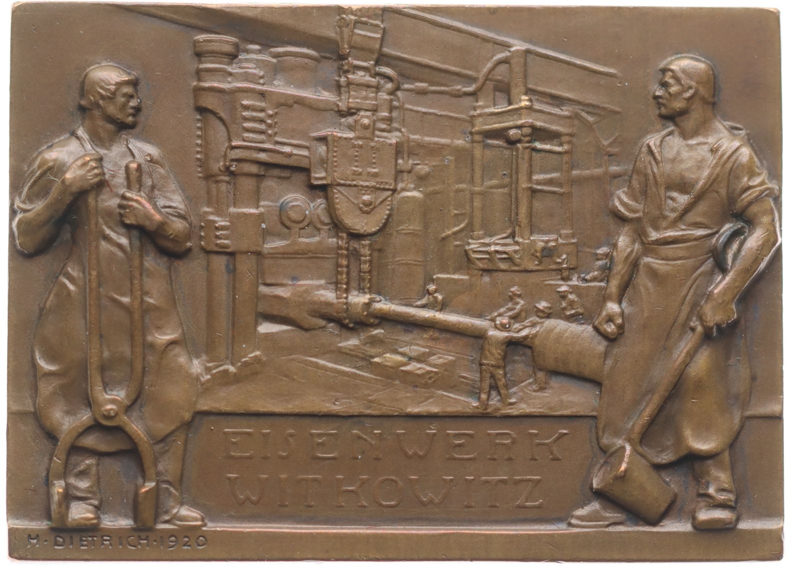 Vítkovické železárny, dva stojící dělníci, pohled na výrobu trub dvouřádkový německý nápis, b.l. Sign.(1920), Bronz.plaketa 35x49 mm _jednostranná