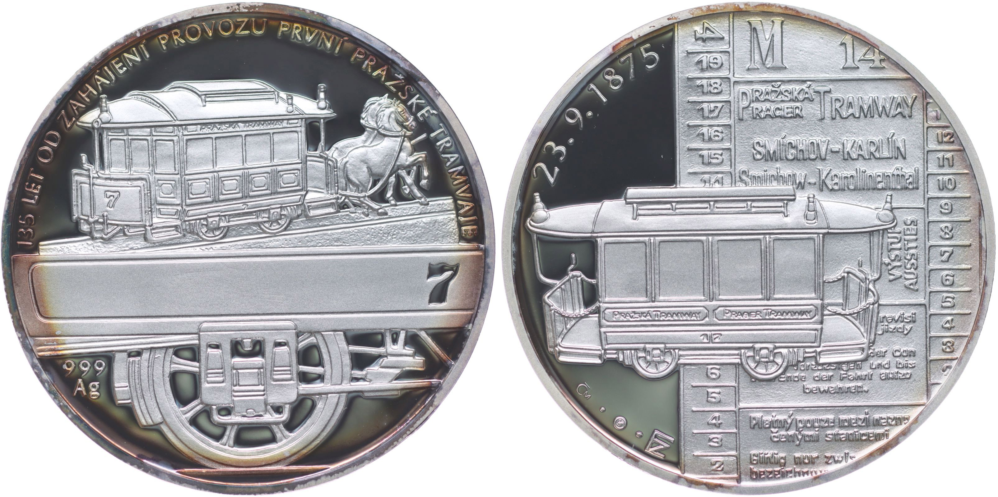135 let zahájení provozu první pražské tramvaje, tzv.koňka 1875 - 2010 Pohled na historickou tramvaj, v pozadí jízdní řád, opis / koňka, opis Sign., Punc.999 Ag 50 mm, 42 g_orig.etue + kasple + certifikát
