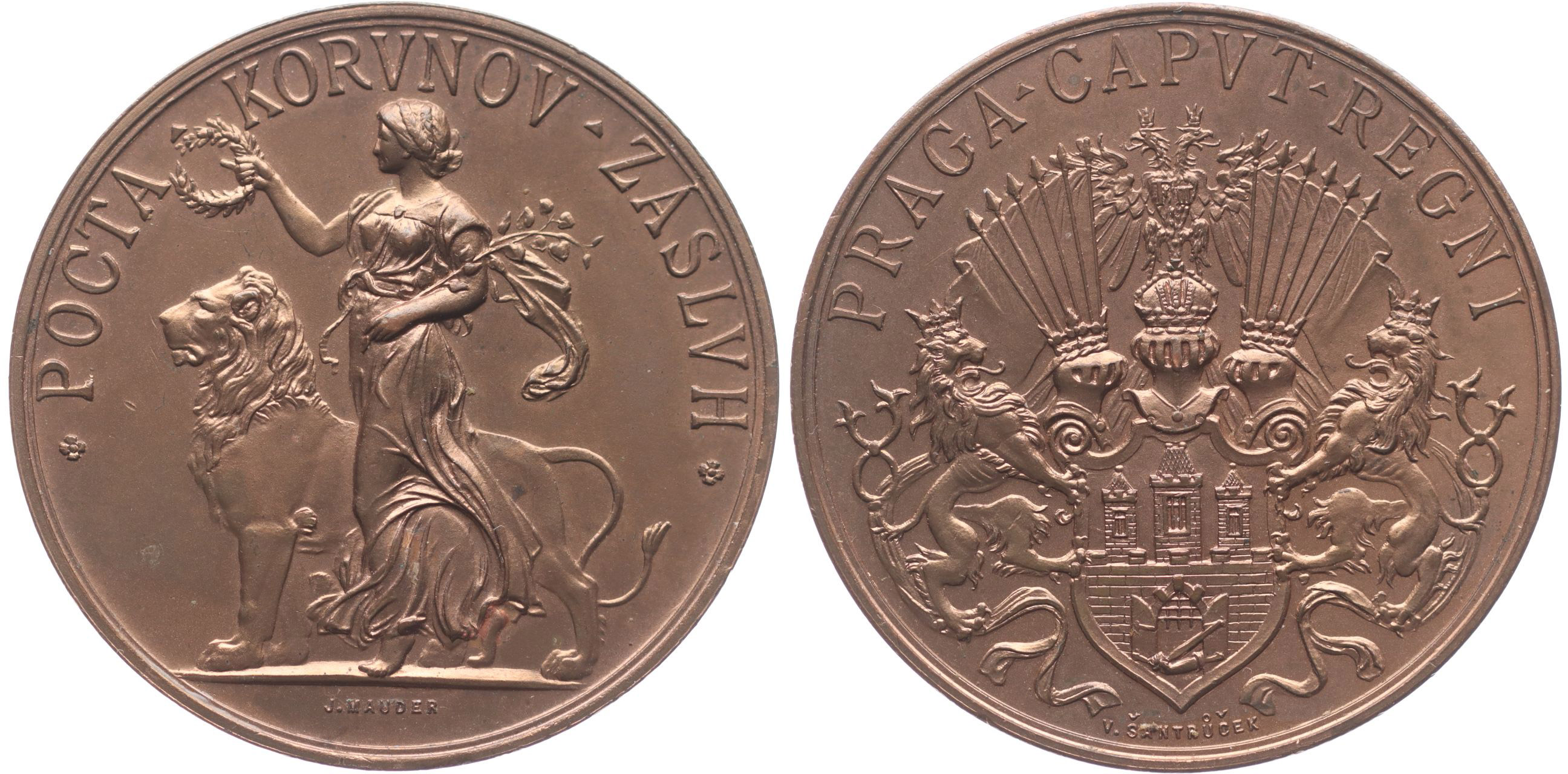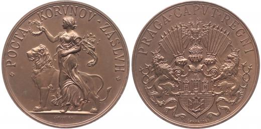 Záslužná medaile hl.města Prahy (1904) Znak města, opis / Čechie kráčející se lvem doleva, opis, na hraně udělení: Nechanský Jindřich 4/III 1918 Sign., Punc., Bronz 40 mm
