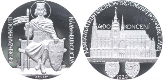 AR Medaile na dokončení velechrámu Sv.Víta, 1929 - 2023 Sv.Václav čelně, nápis / budova katedrály, zemské znaky, nápis a opis, Sign., Punc.999, Ag 37 mm, 31,1 g _oriog. etue + kapsle + certifikát