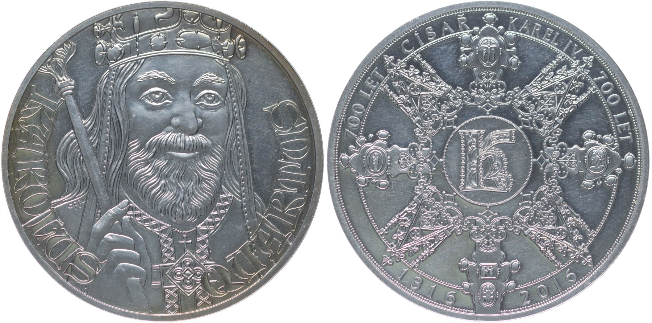 Nesign. - 700 let císař Karel IV., 1316 - 2016 Poprsí císaře čelně, opis / stylizov."K", 8 znaků, opis Punc.999 Ag 33 mm, 15,60 g