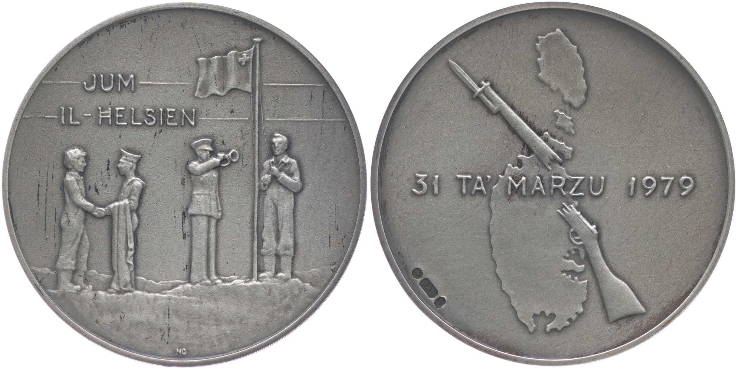 Medaile k odchodu britských vojsk z Malty 31.3.1979 Čtyři postavy, vlajka, nápis / puška na bvodu ostrova, nápis Sign., Punc.925, Ag 38 mm, 30,19 g_R!