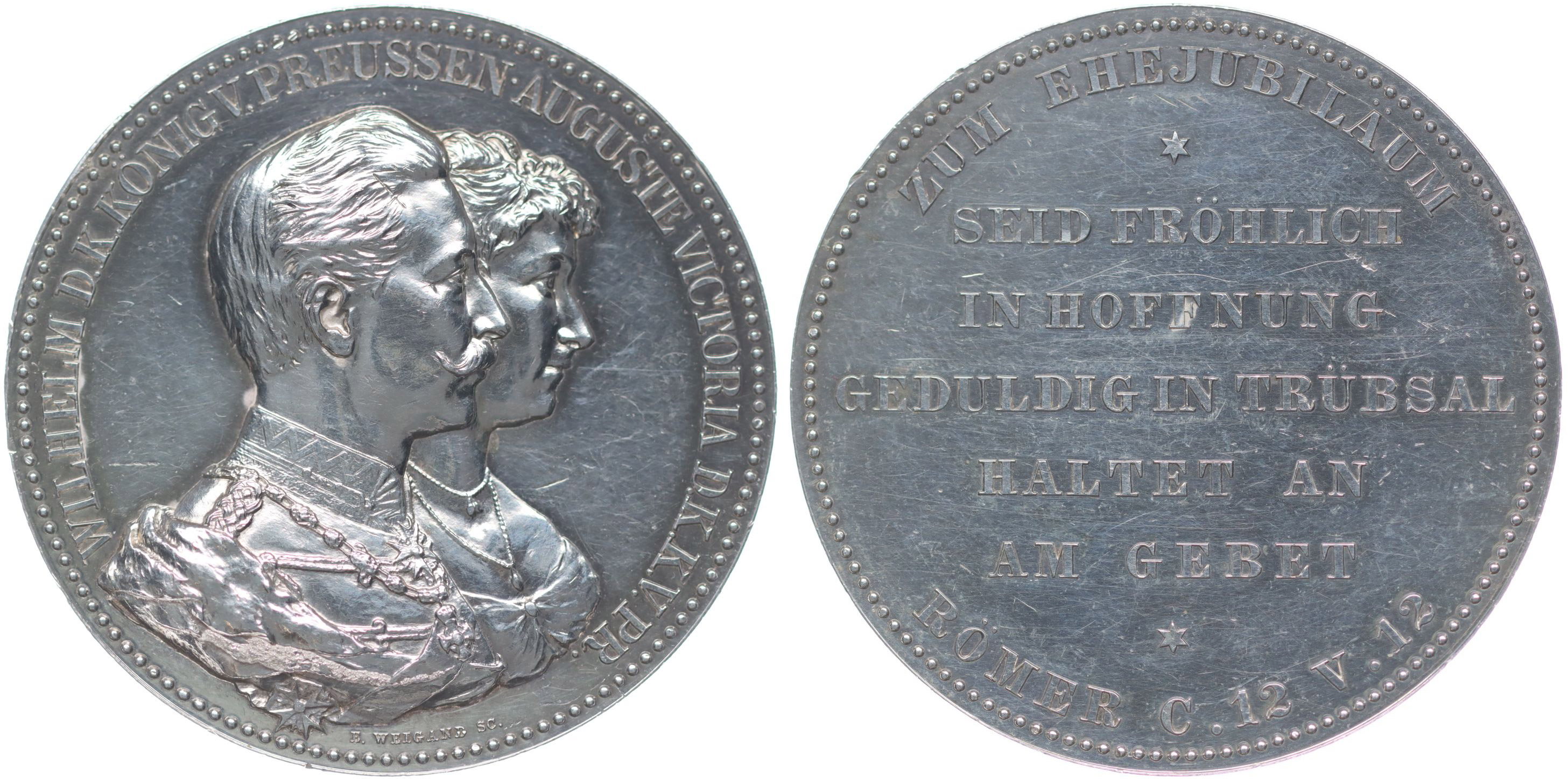 F.Weigand - výročí sňatku císařského páru, b.l.(1906) Dvojportrét zprava, opis / 7řádkový nápis, hvězdičky Sign., Nepunc., Ag 45 mm, 50,96 g