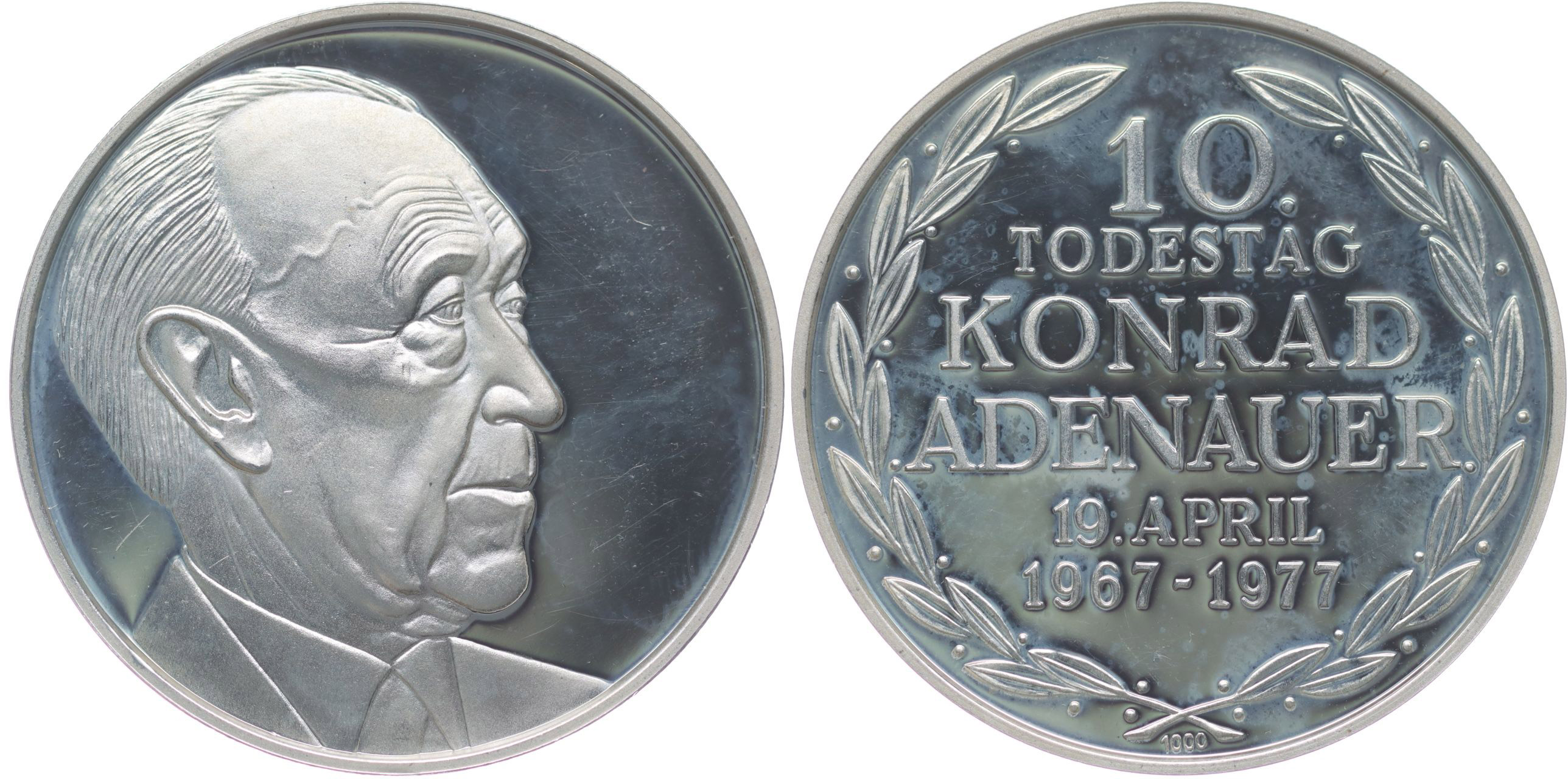 K.Adenauer - medaile k 10.výročí úmrtí 1967 - 1977 Poprsí zprava / 6řádk.nápis ve věnci, Punc.1000 Ag 40 mm, 25,02 g