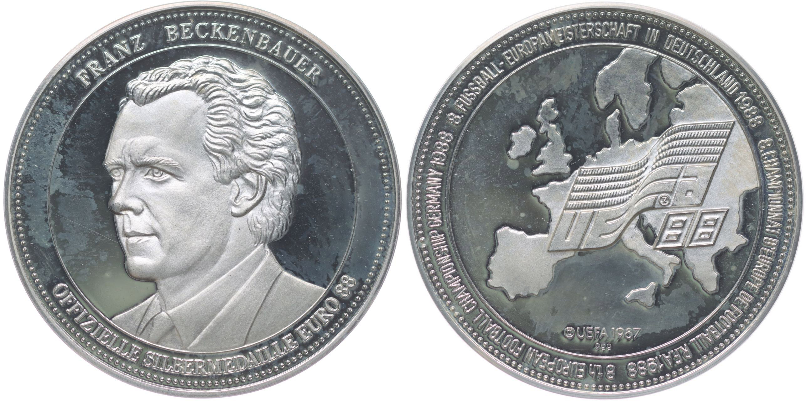 Nesign. - Franz Beckenbauer - ME ve fotbale 1988 Poprsí zleva, opis / mapa Evropy s vlajkou, opis Punc.999, Ag 40 mm, 19,74 g_orig.kapsle