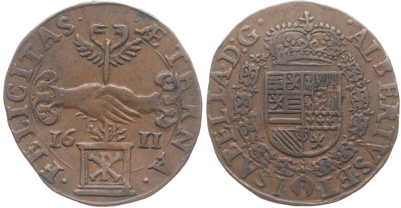 Nesign. - Albert a Isabela na věčné přátelství 1611 Spojené ruce drží cadecus, znak Krista, vročení, opis / španělský znak, opis, Cu 30 mm, van Loon.II/74, Dugn.3670_R!