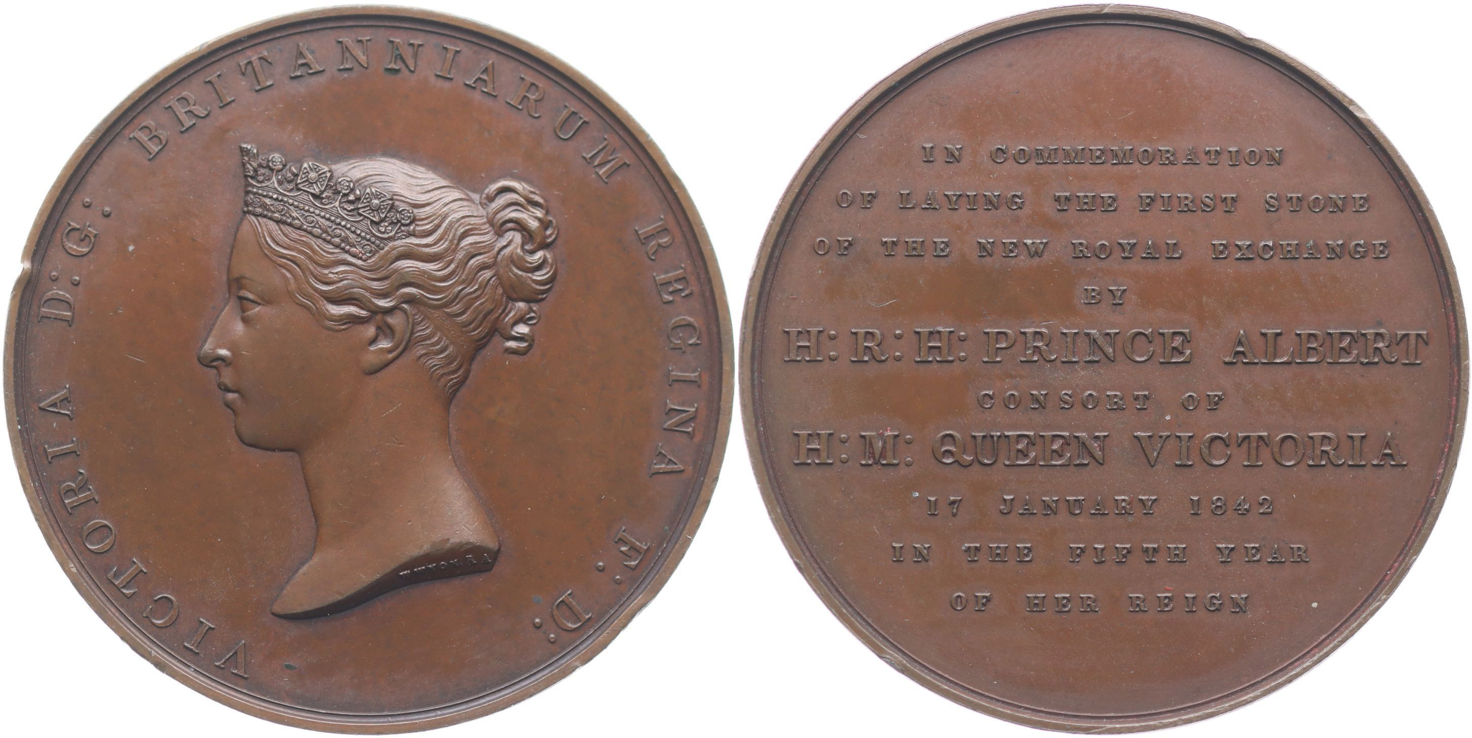 Victoria a Albert - pamětní medaile k položení základního kamene Královské burzy v Londýně v r.1842, poprsí královny zleva, opis / 10řádk.nápis, Sign.W.Wyon R.A, Bronz 45,5 mm, 45,16 g_dr.hr. v av.