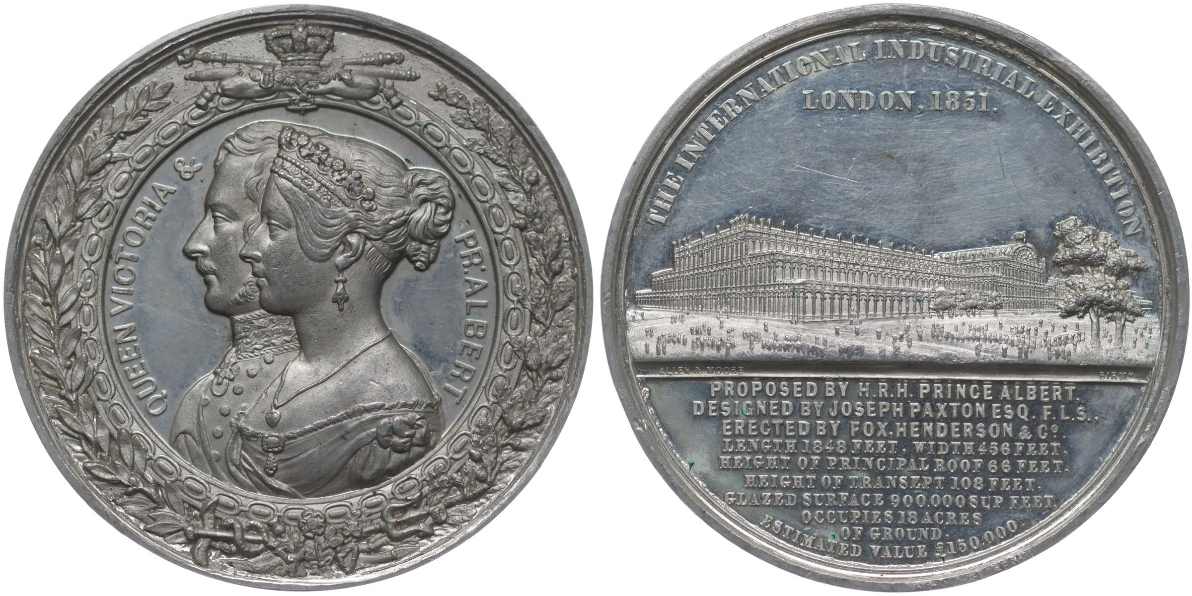 Victoria a Albert - průmyslová výstava v Londýně, 1851 Poprsí králov.páru zleva, opis a věnec / Crystalpalace, opis, 10řádk. nápis v úseči, Sign.Allen&Moore-Birm., Sn 51 mm, 39,44 g