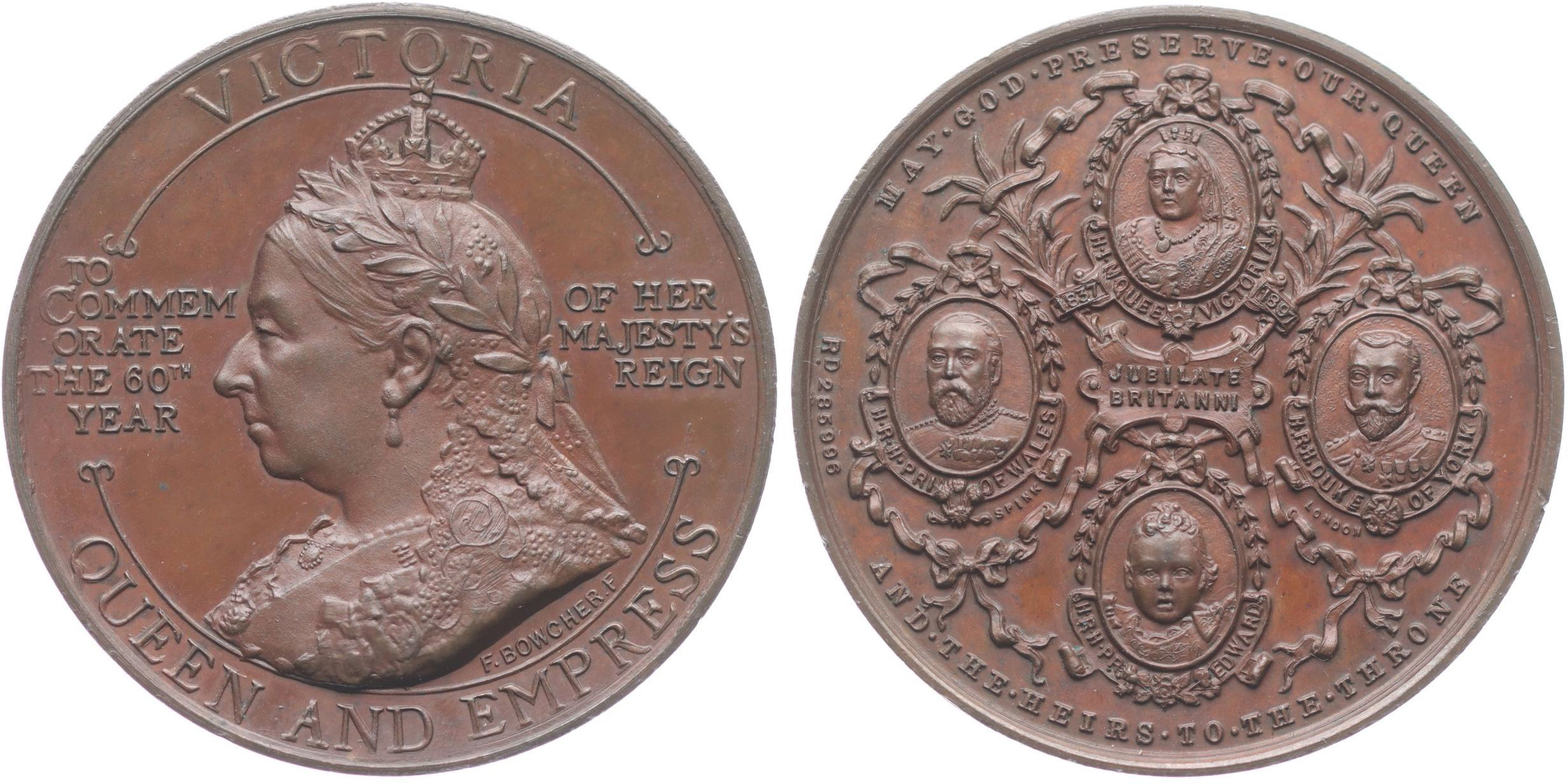Victoria - pamětní medaile na 60 let vlády s dědici trůnu, 1897 Poprsí královny zleva, čřádk.nápis, opis / 4 medailony s královnou a a třemi generacemi následníků (Edwards VII., Jiří V. a Edward VIII.) Sign.F.Bowcher Spink London, Bronz 38,5 mm, 22,78 g