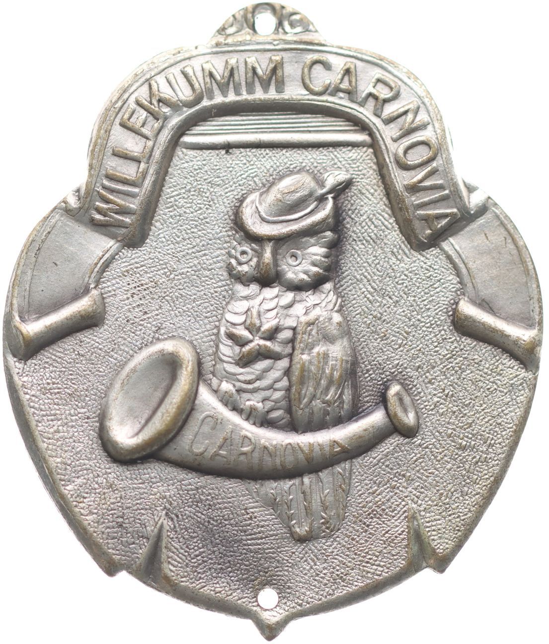 Krnov (Willekumm Carnovia) - sova s kloboukem na trubce, na stuze nápis, Postř.plech 40x34 mm_jednostr. orig.ouško R!