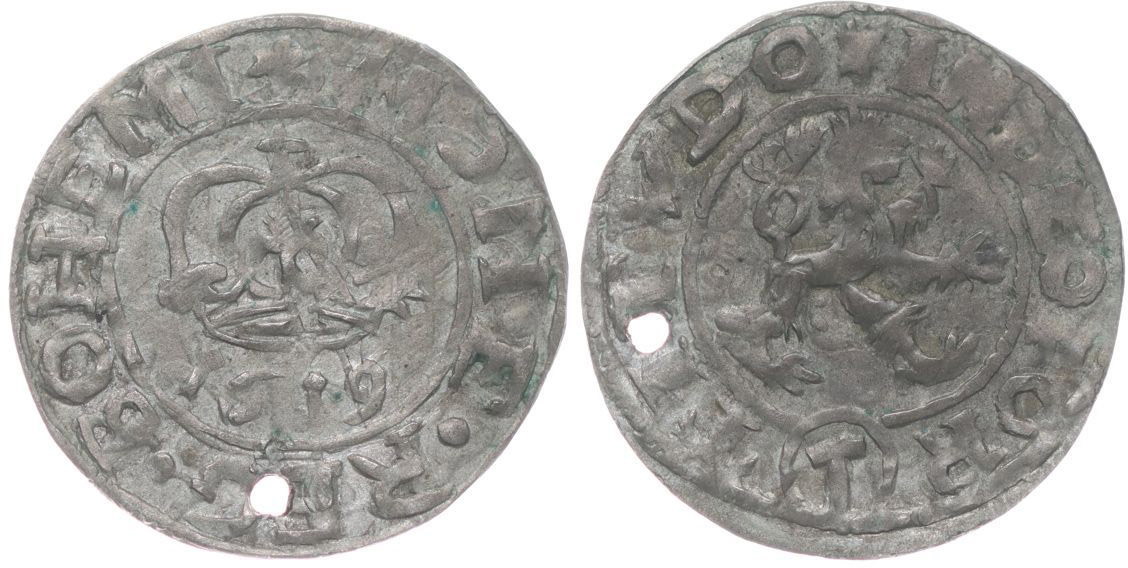 České stavy - Krejcar 1619, Kutná Hora - Hölzl, lev zprava! 17,5 mm, 0,65 g, Nech.35_dírka