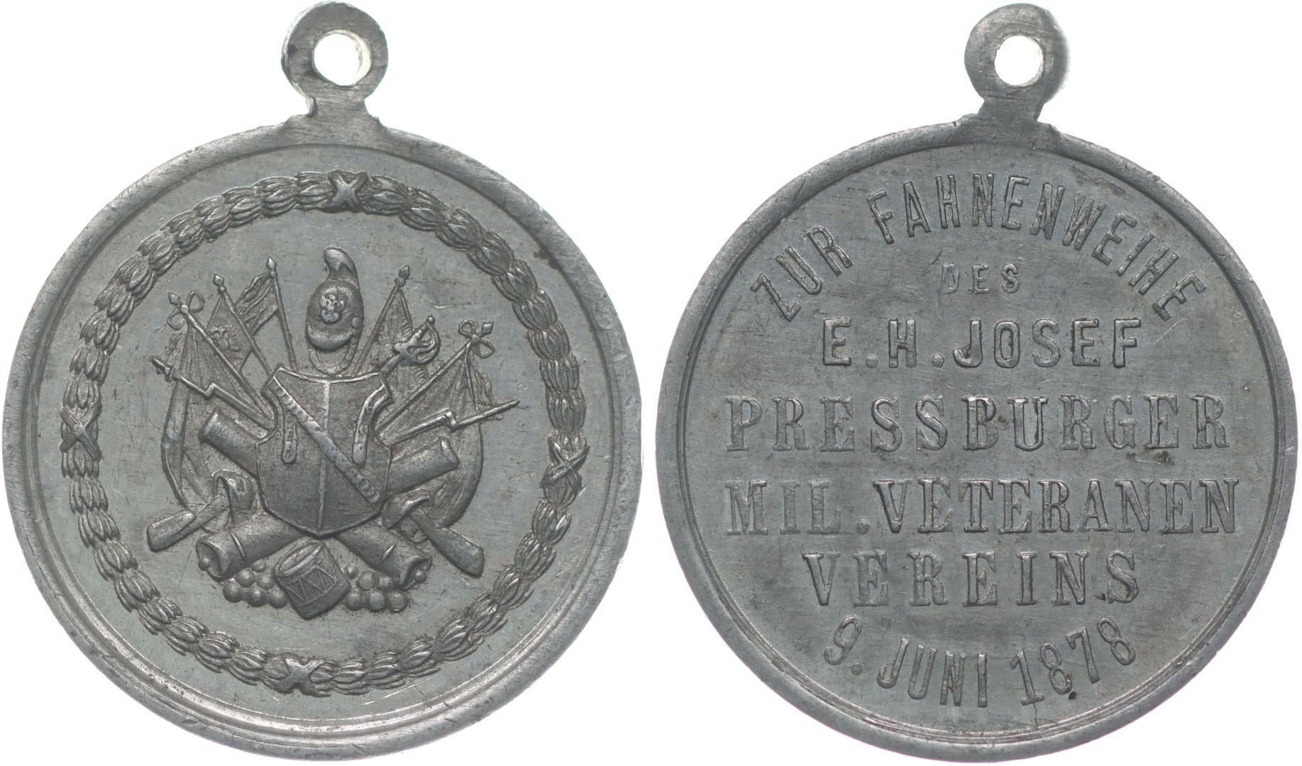 Bratislava (Pressburg) - slavnost svěcení praporu 9.6.1878 Vojenské atributy ve věnci / 4řádk.nápis, opis, Sn 38,5 mm _orig.raž.ouško