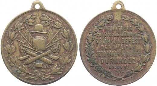 Drnholec (Dürnholz) - slavnost k 25.výr. spolku vysloužilců 29.6.1906 Vojenské atributy ve věnci / 9řádk.nápis, Bronz 33 mm_orig.raž.ouško
