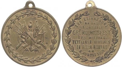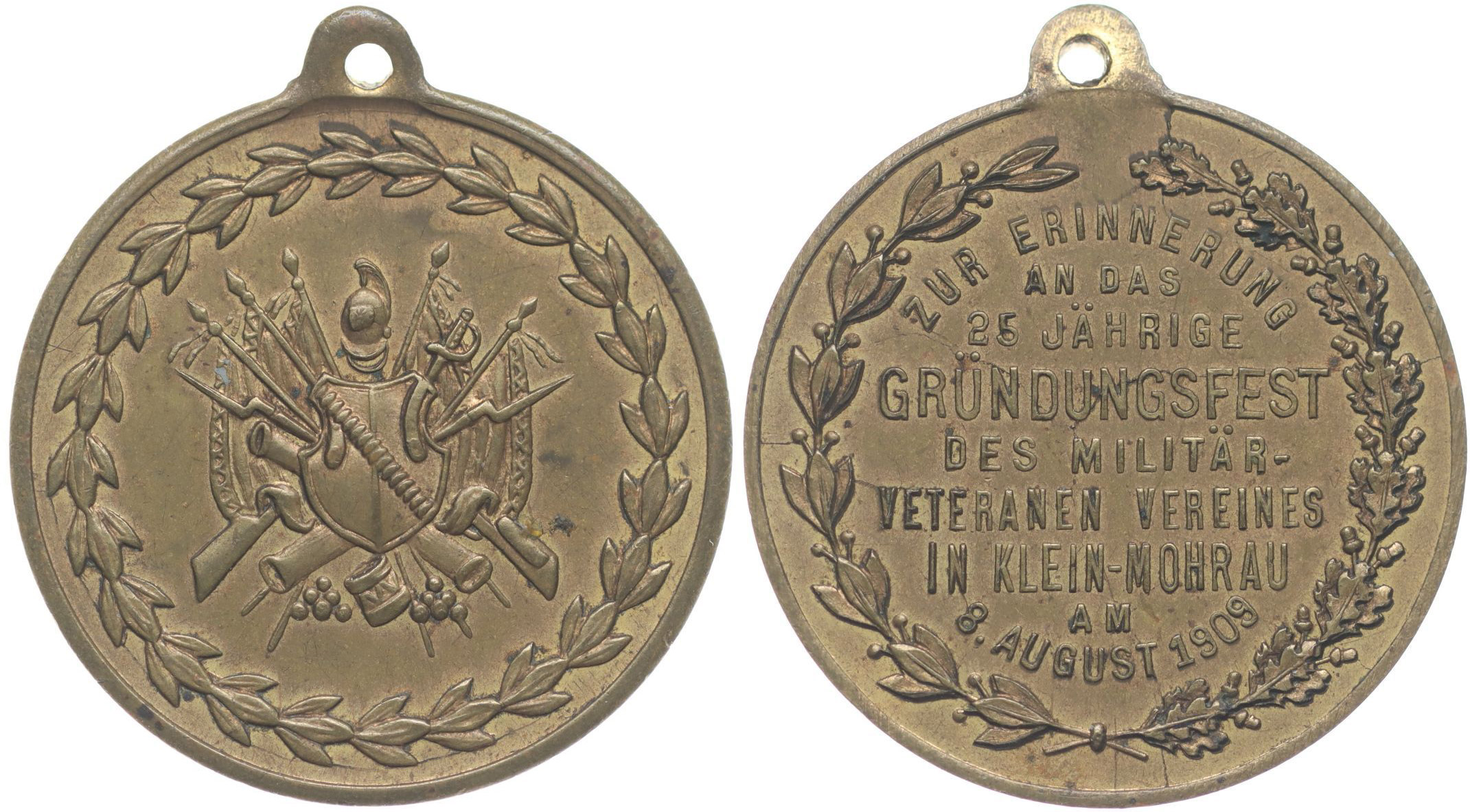 Malá Morávka (Klein Mohrau) - v upomínku na 25 leté trvání spolku vojenských veteránů 8.8.1909, vojenské atributy ve věnci / 9řádk.nápis na věnci, Pozlac.bronz 33 mm_orig.raž.ouško