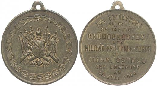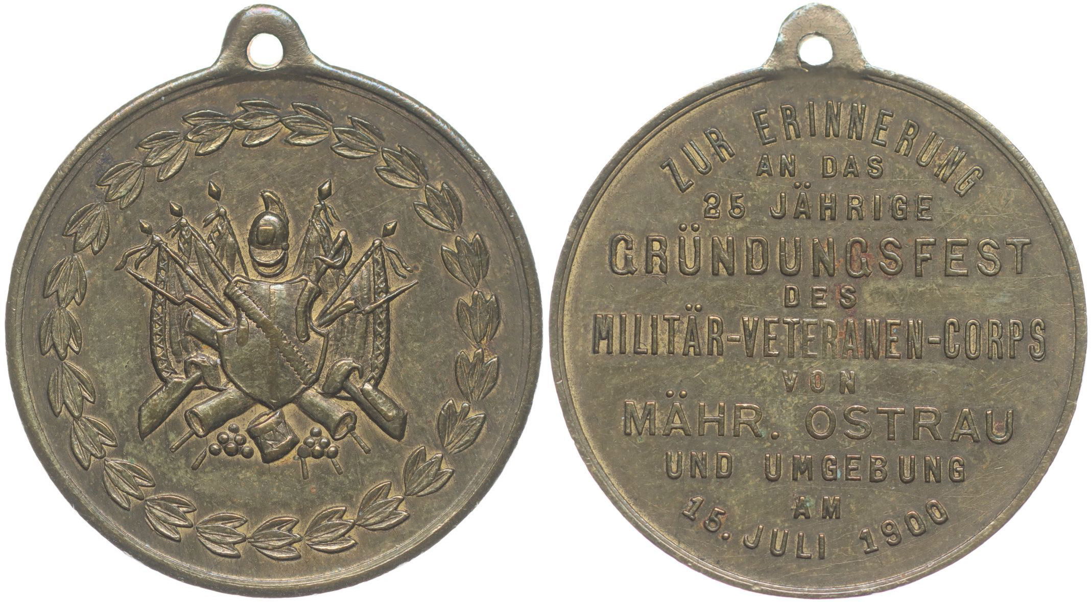 Mor.Ostrava - v upomínku na slavnost 25.výr.trvání spolku vojenských vysloužilců 15.7.1900, vojenské atributy ve věnci / 11řádk.nápis Mosaz 33 mm_orig.raž.ouško