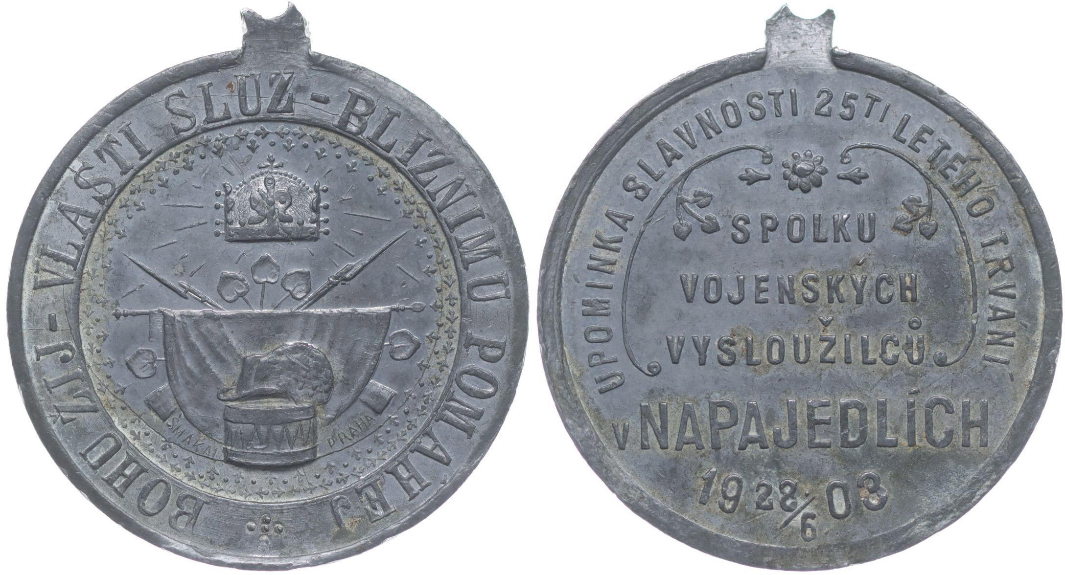 Napajedla - upomínka slavnosti 25ti letého trvání spolku vojenských vysloužilců 28.6.1903, korunované vojenské atributy s praporem, bubnem a psem, opis / 4řádk.nápis, opis, Sn 34 mm_vyl.ouško