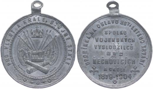 Řečkovice - upomínka na oslavu 25ti letého trvání spolku vojenských vysloužilců 1879 - 1904, koruov. vojenské atributy s praporem, bubnem a psem, český opis / 6řádk.nápis, český opis, Pb 34 mm_orig.raž.ouško