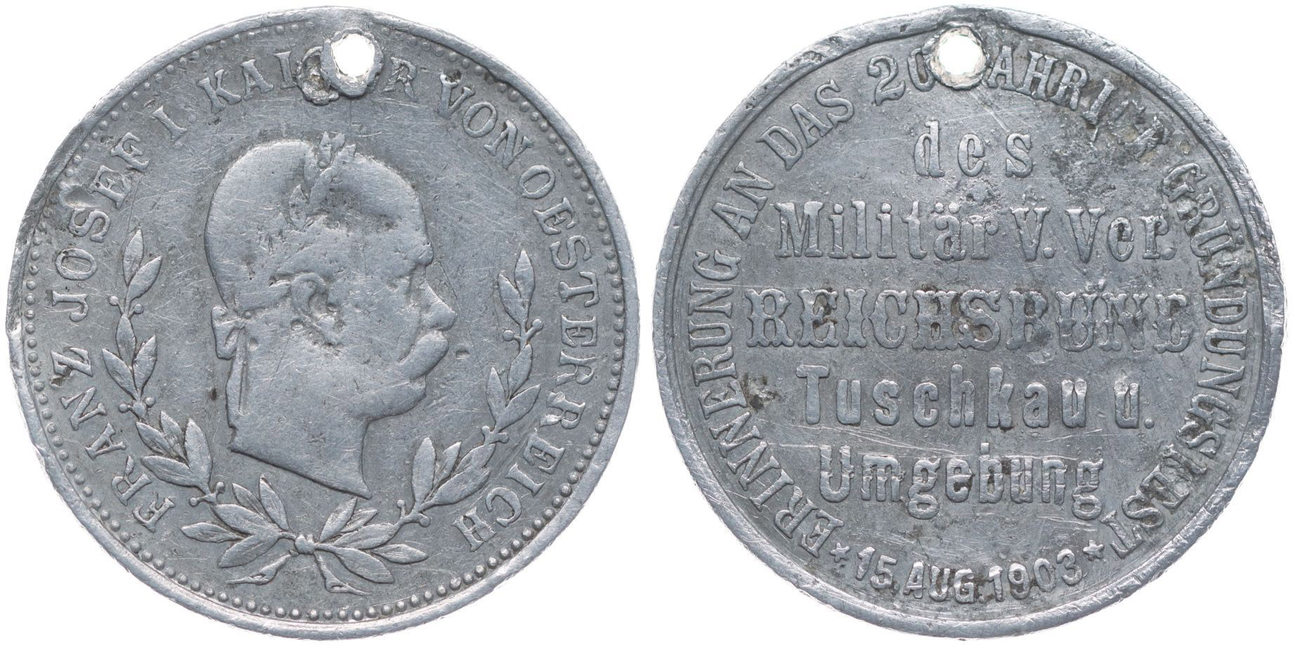 Touškov (Tuschkau) - upomínka na slavnost 20ti letého trvání spolku vojenských veteránů 15.8.1903, Sn 29 mm_dírka RR!