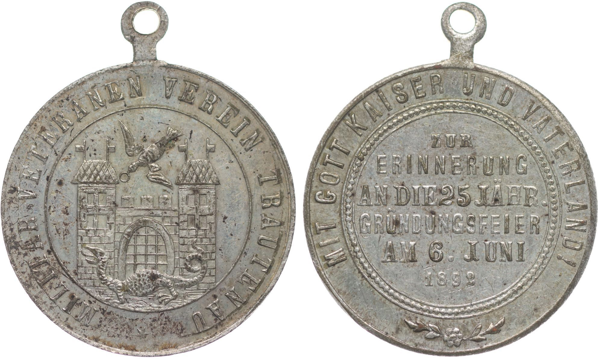 Trutnov (Trautenau) - v upomínku na slavnost k 25.výročí spolku vojenských veteránů 6.6.1892, znak města, opis / 6řádk.nápis, opis, Postř.bronz 31 mm_orig.raž.ouško