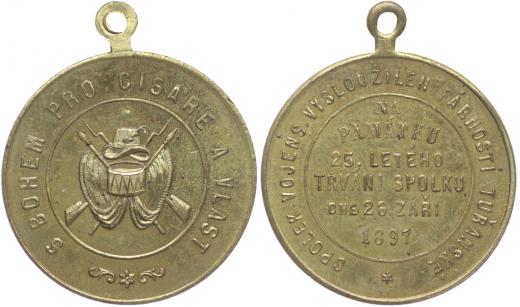 Tuřany - spolek vojens.vysloužilen fárnosti tuřanské 26.září 1897 S Bohem pro císaře a vlast - voj.atributy / 6řádk.nápis, opis Pozlac.bronz 32 mm_orig.raž.ouško