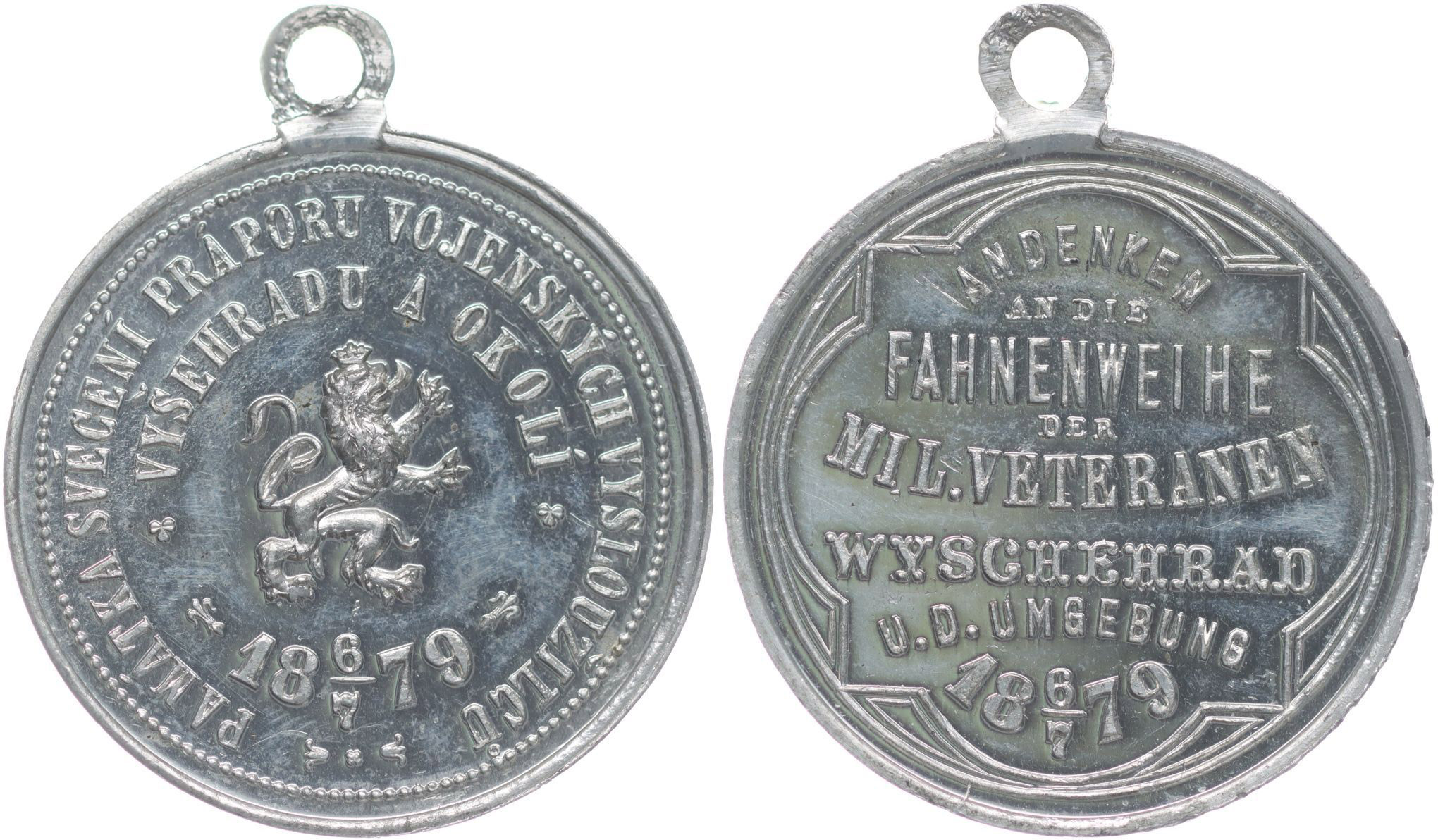 Vyšehrad - památka svěcení práporu vojenských vysloužilců 6.7.1879 Korunovaný český lev zprava, dvojitý český opis / 8řádk.německý nápis v kartuši, Sn 32 mm_orig.raž.ouško