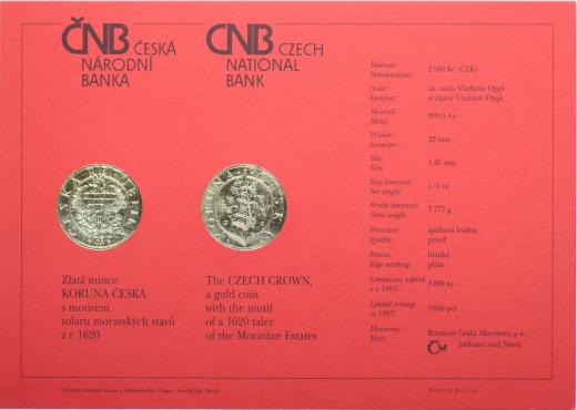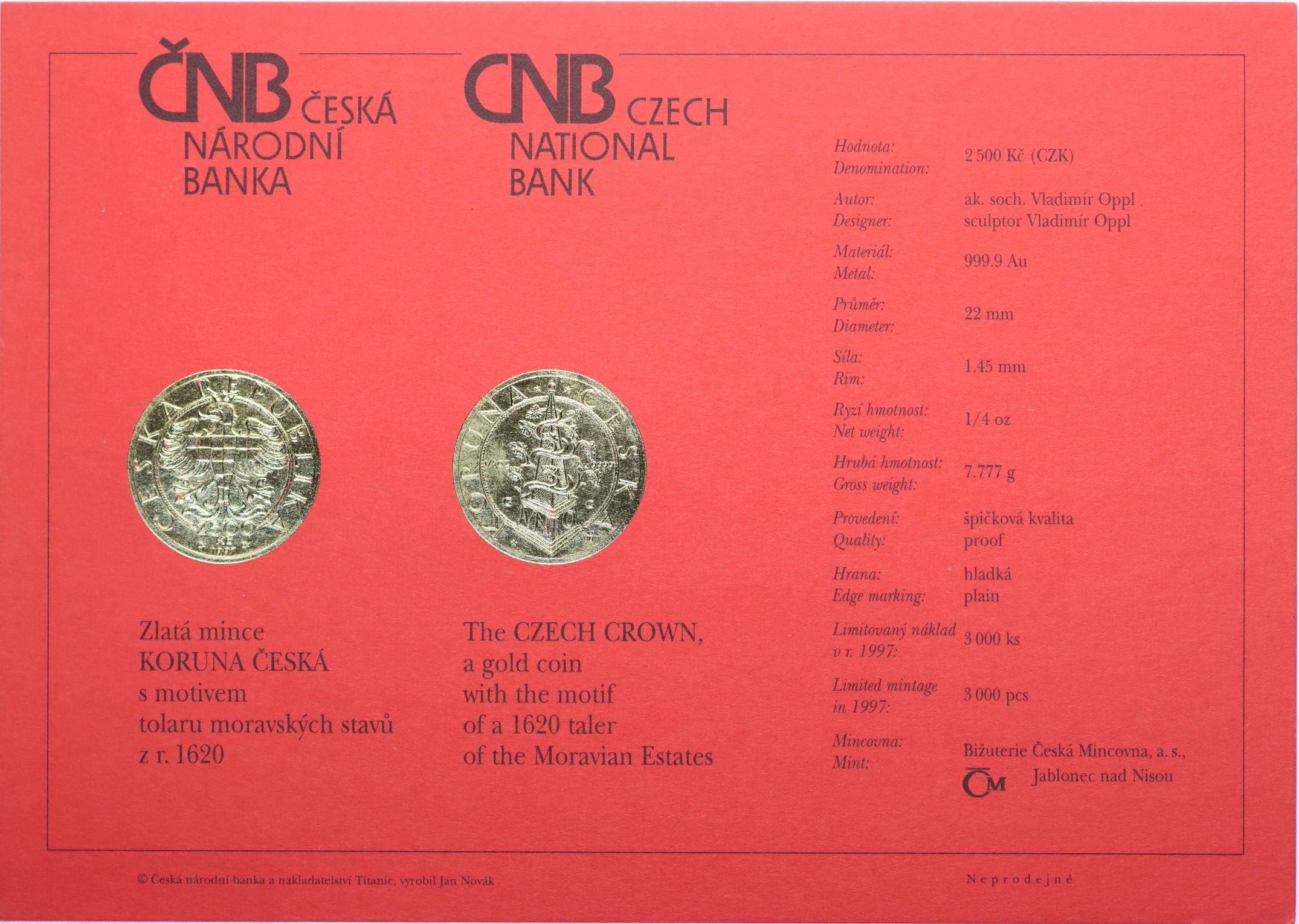 Karta (certifikát) pro minci 2500 Kč 1997 - tolar Moravských stavů