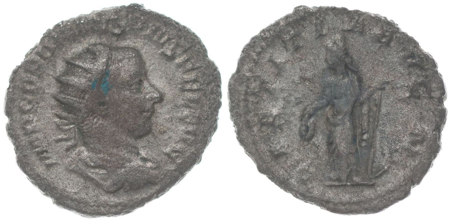 AR Antoninianus, Rv:"LAETITIA.AVG.N.", stojící Laetitia zleva Kamp.72.19, S.2338, C.121, RIC.86