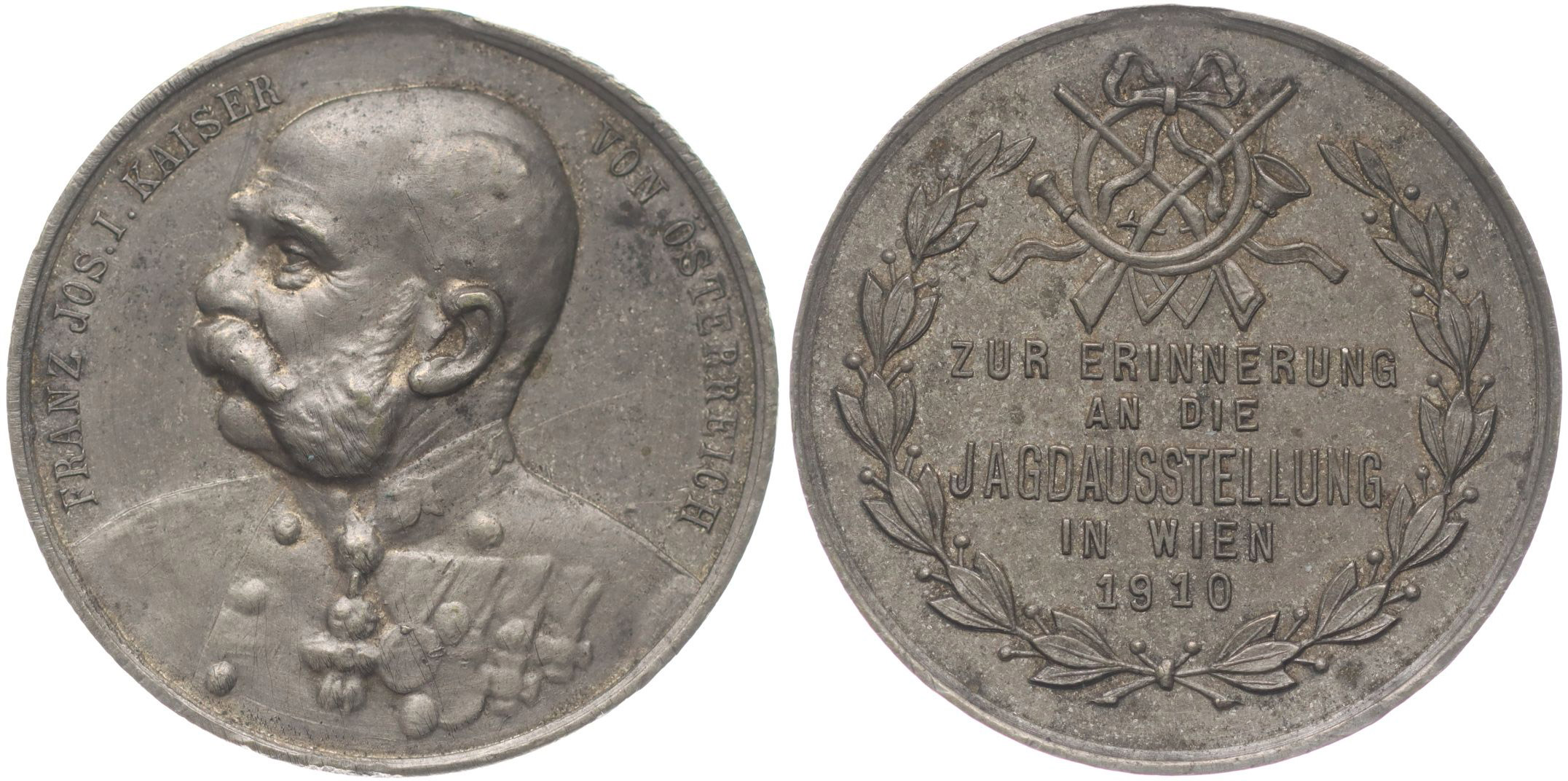 Nesign. - v upomínku na loveckou výstavu ve Vídni 1910 Poprsí císaře zleva, opis / pod loveckými atributy 5řádk.nápis ve věnci, Obecný kov 34 mm_odstr.ouško