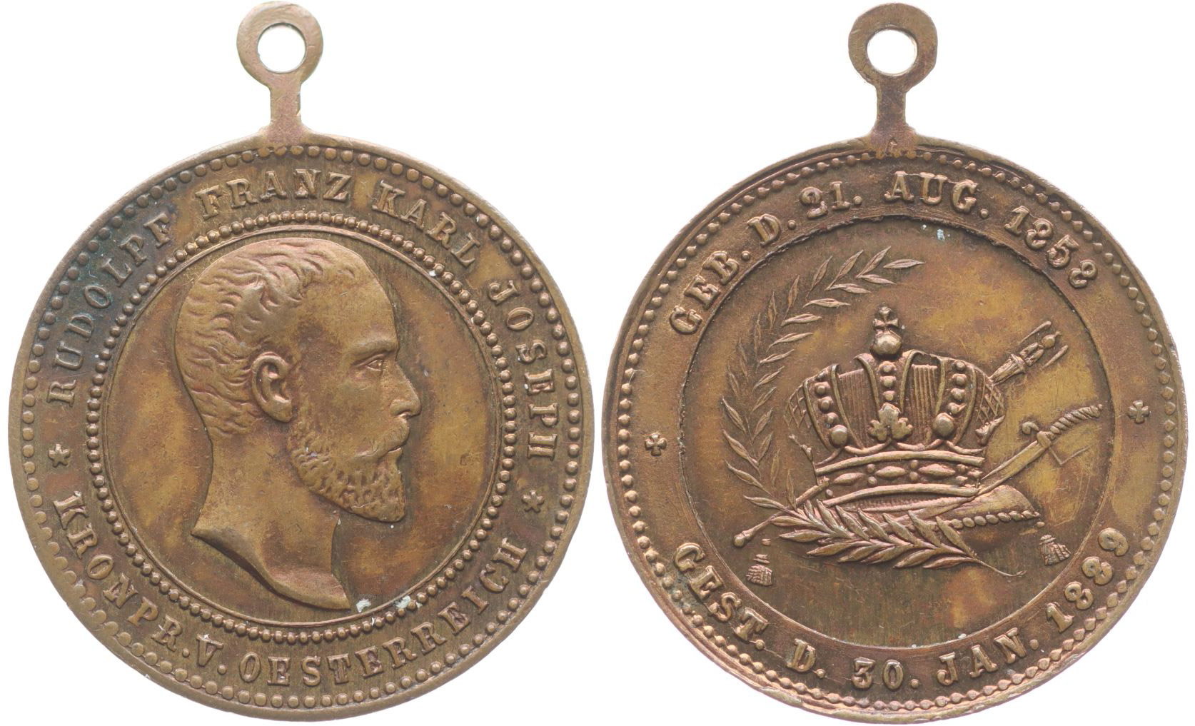 Nesign. - úmrtní medailka, 30.1.1889 Hlava zprava, opis / koruna, žezlo a meč na podušce, data narození a úmrtí, Nesign., Bronz 26 mm_orig.raž.ouško